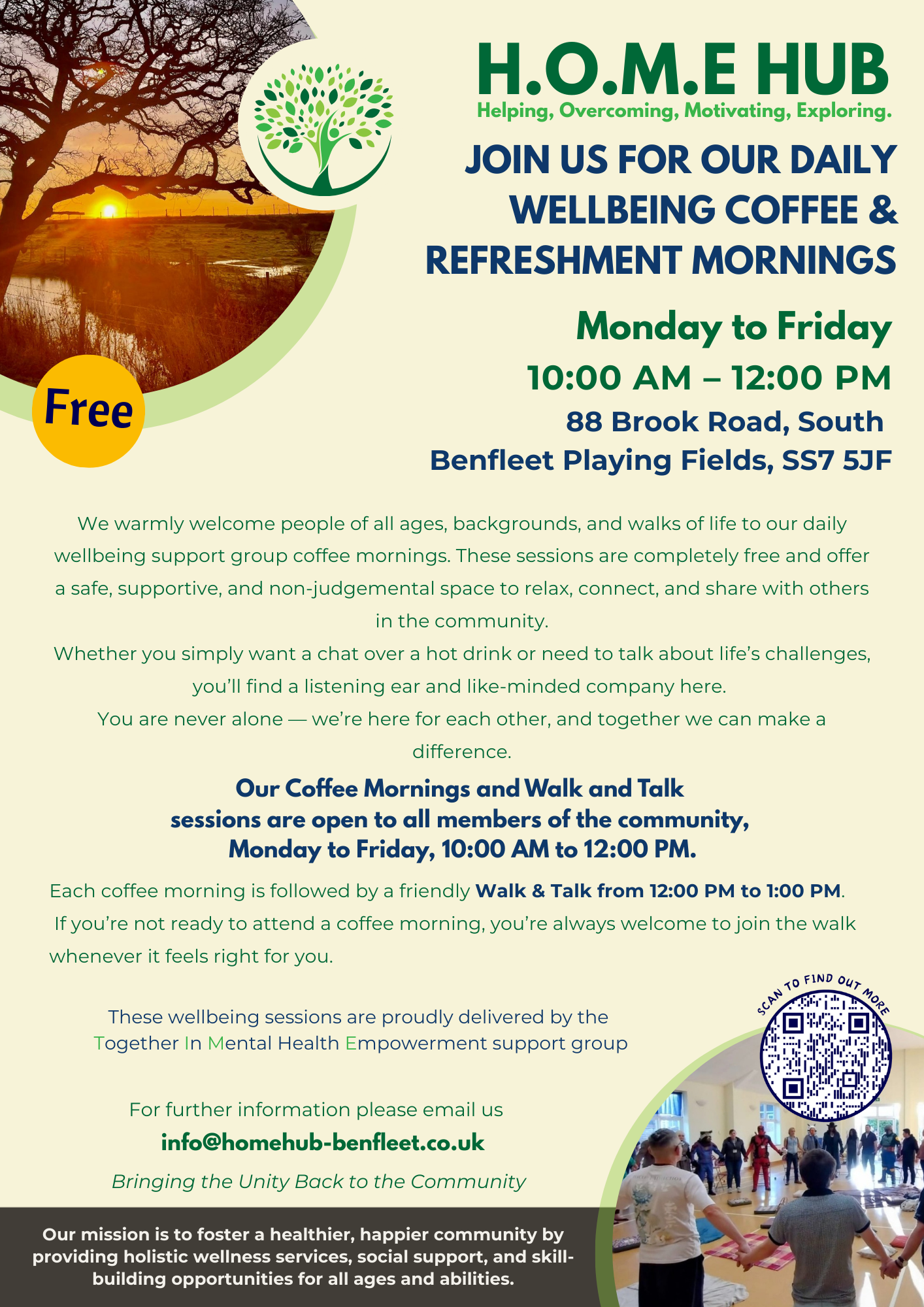 At the Home Hub, we are building an inclusive, supportive community where everyone has access to the tools, connections, and opportunities they need to thrive. Guided by compassion, equality, and sustainability, we create safe spaces that promote wellbeing, reduce isolation, and empower people of all ages and abilities to reach their full potential
